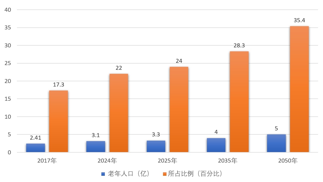 十四五末期,中國老齡人口將超過3億;2035年左右我國60歲及以上老年人口將突破4億,在2050年前后達到頂峰,約占總人口的1/3。那時,中國將有4.8億、甚至接近5億老年人,是世界上老年人口最多的國家。